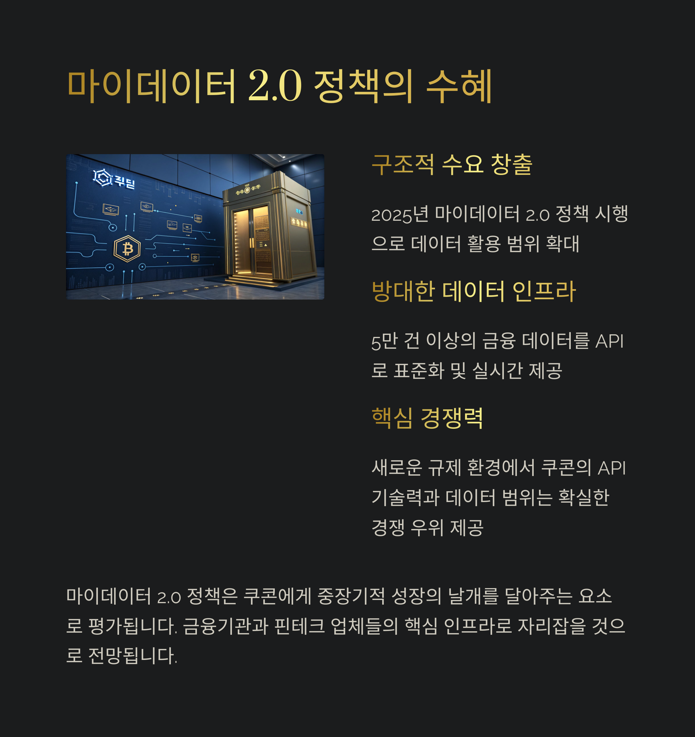 새로운 규제 환경에서 쿠콘의 API 기술력과 데이터 범위는 확실한 경쟁력을 갖추고 있으며, 이는 중장기적 성장에 날개를 달아주는 요소로 평가됩니다.