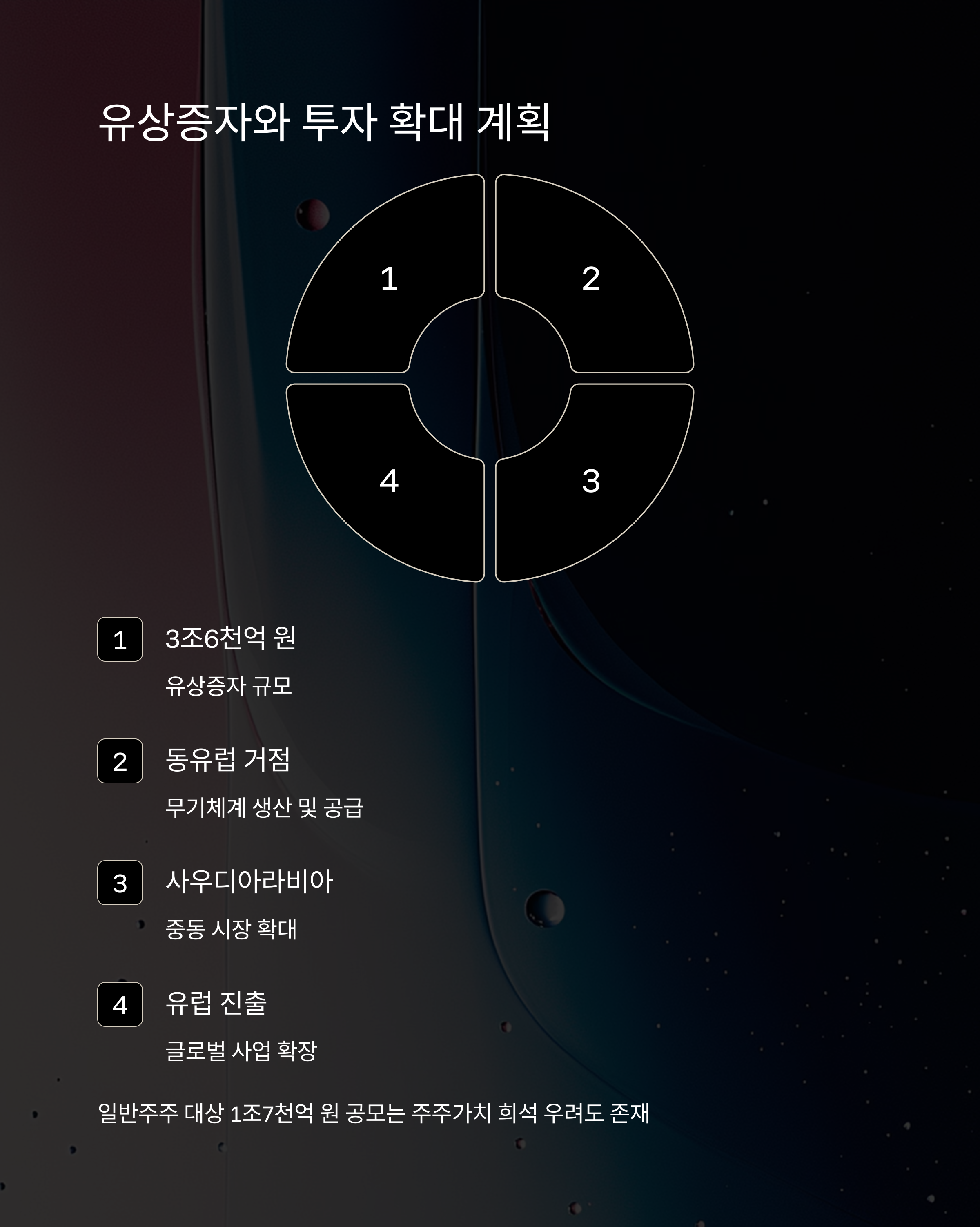 한화에어로스페이스는 향후 글로벌 사업 확대를 위해 3조6천억 원 규모의 유상증자를 단행했다. 이를 통해 동유럽·사우디아라비아·유럽 내 무기체계 생산 및 공급 거점을 확보할 계획이다. 그러나 일반주주 대상의 1조7천억 원 공모는 주주가치 희석과 단기 주가 하락에 대한 우려를 낳고 있다. 이러한 대규모 자금 조달은 투자 측면에선 긍정적이나 단기적인 부담 요인이 될 수도 있다.