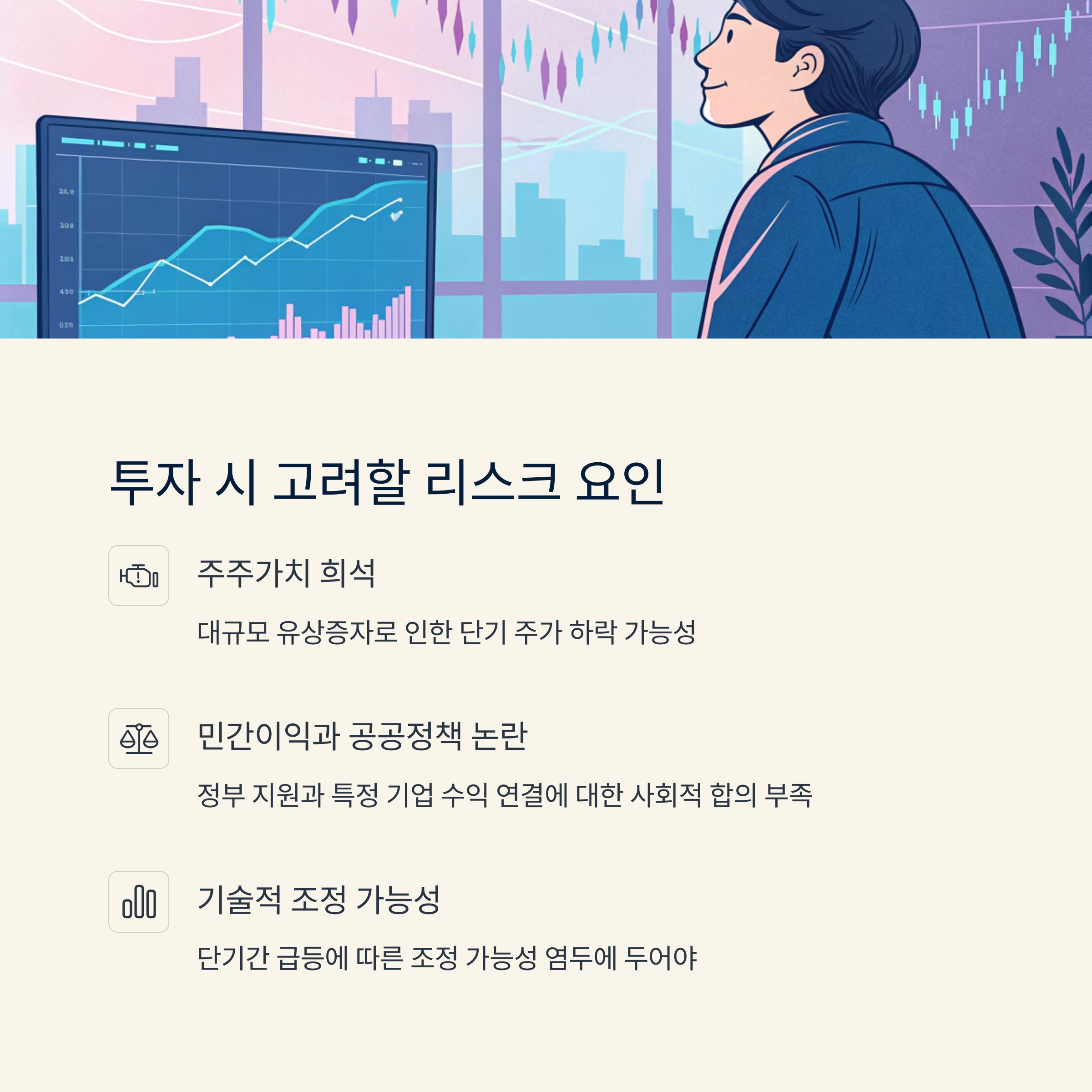 한화에어로스페이스 주가 전망은 실적, 수주, 정부 정책, 글로벌 수요라는 네 가지 축 위에서 형성된다. 현재까지는 모두 긍정적인 흐름이지만, 유상증자 후 주가 반응, 추가 수출 계약 여부, 정부의 실질적 지원 내용 등을 고려해 중장기적으로 보수적인 접근이 권장된다. 특히 주가가 단기간 급등한 만큼, 투자자는 기술적 조정 가능성도 염두에 두어야 한다.