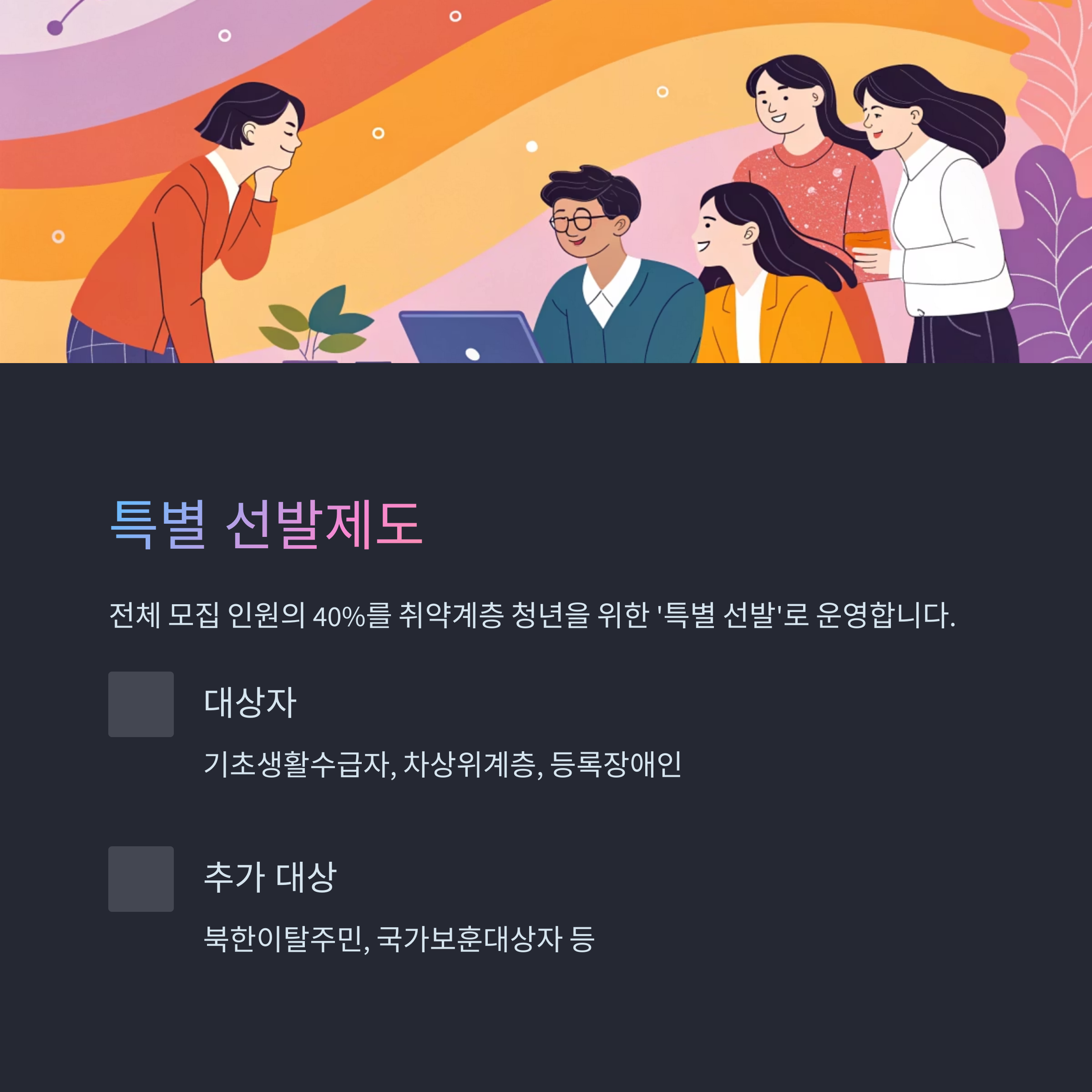 서울시는 취약계층 청년들을 위해 전체 모집 인원의 40%를 ‘특별 선발’로 운영합니다. 해당자는 기초생활수급자, 차상위계층, 등록장애인, 북한이탈주민, 국가보훈대상자 등에 해당하는 대학생입니다.