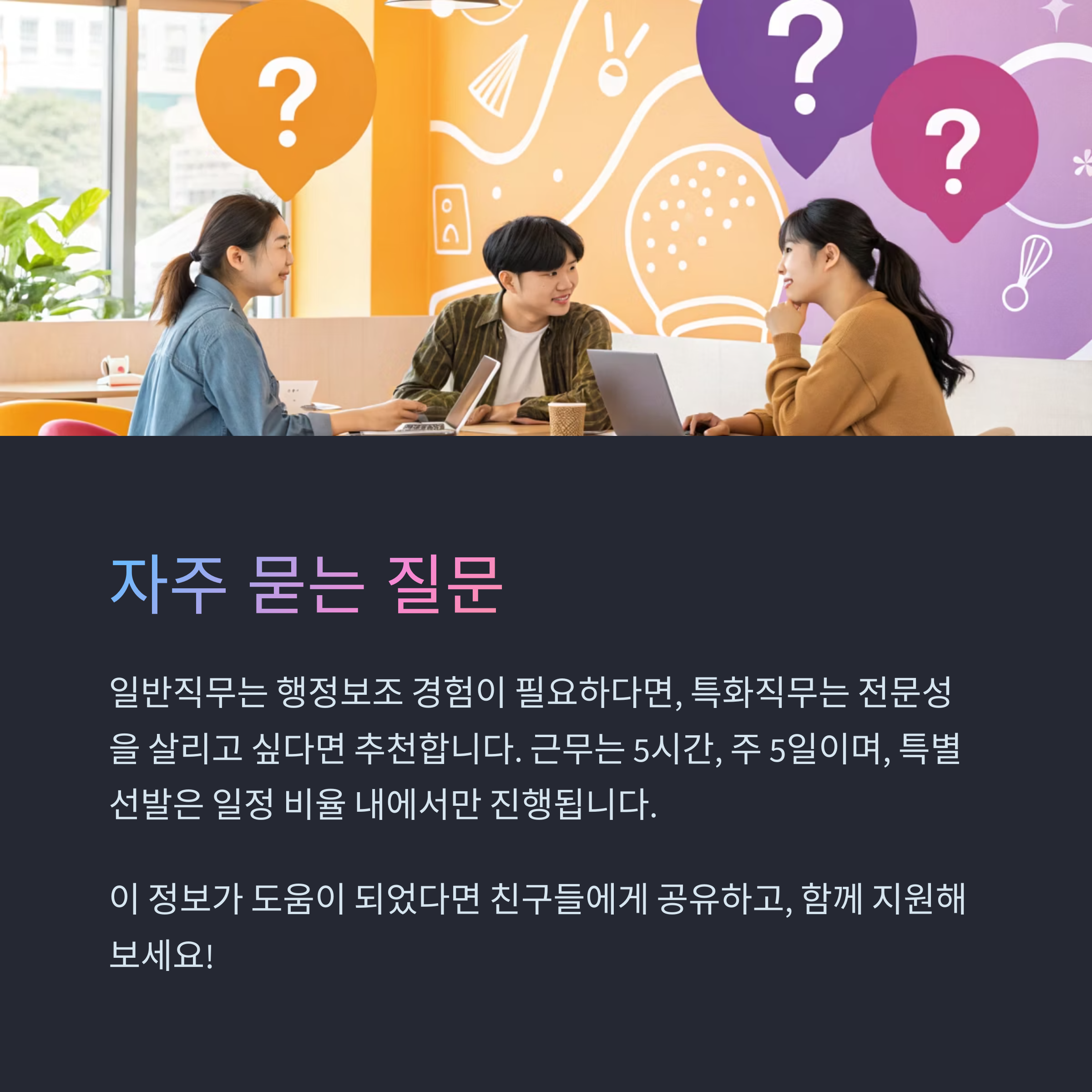 자신의 전공이나 경력, 관심 분야에 따라 선택하는 것이 가장 좋습니다. 단순 행정보조 경험이 필요하다면 일반직무, 전문성을 살리고 싶다면 특화직무를 추천합니다.