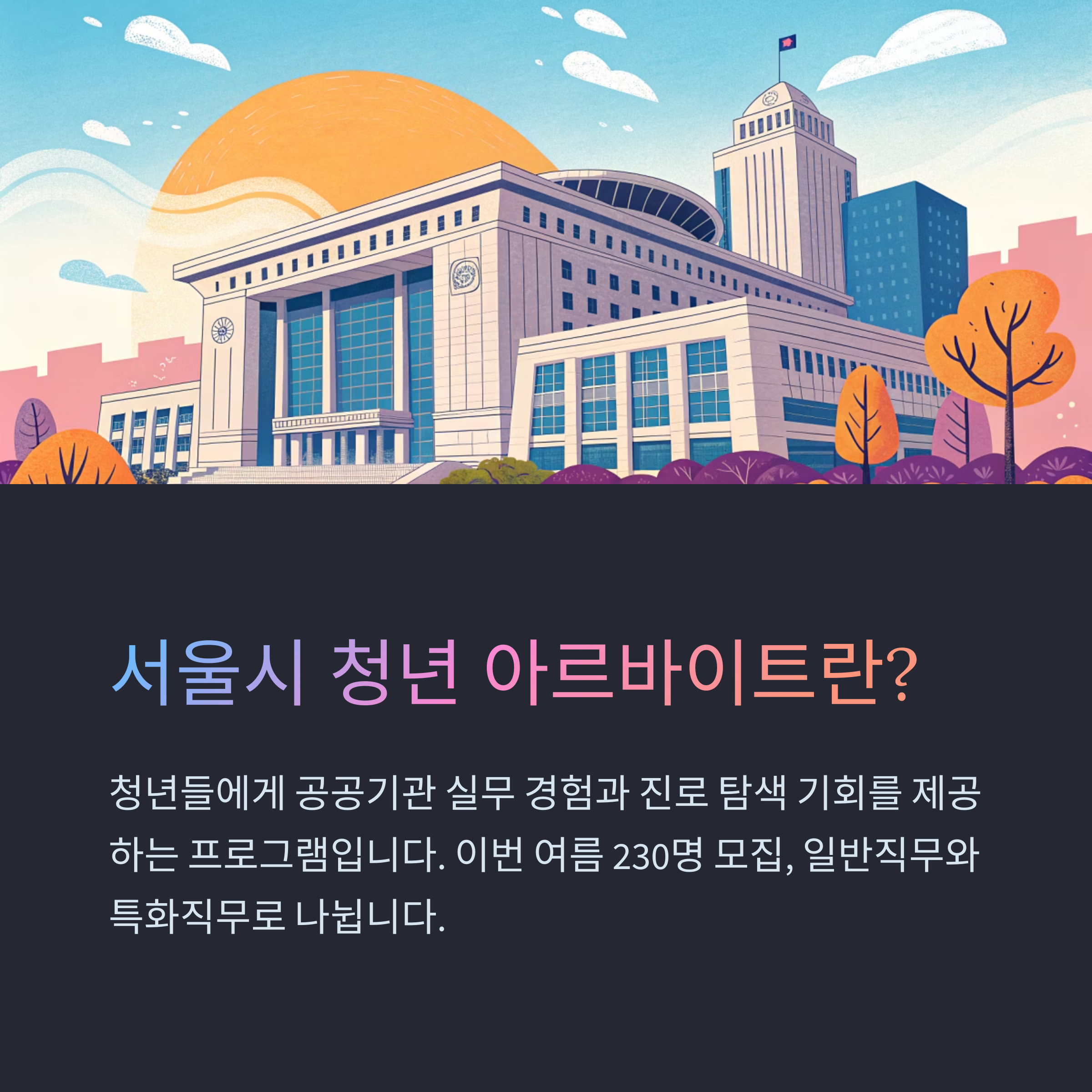 서울시가 매년 실시하는 시정체험 아르바이트는 청년들에게 공공기관에서의 실무 경험과 진로 탐색 기회를 제공하는 프로그램입니다. 이번 여름에도 230명을 모집하며, 일반직무와 특화직무로 나뉘어 지원할 수 있습니다.