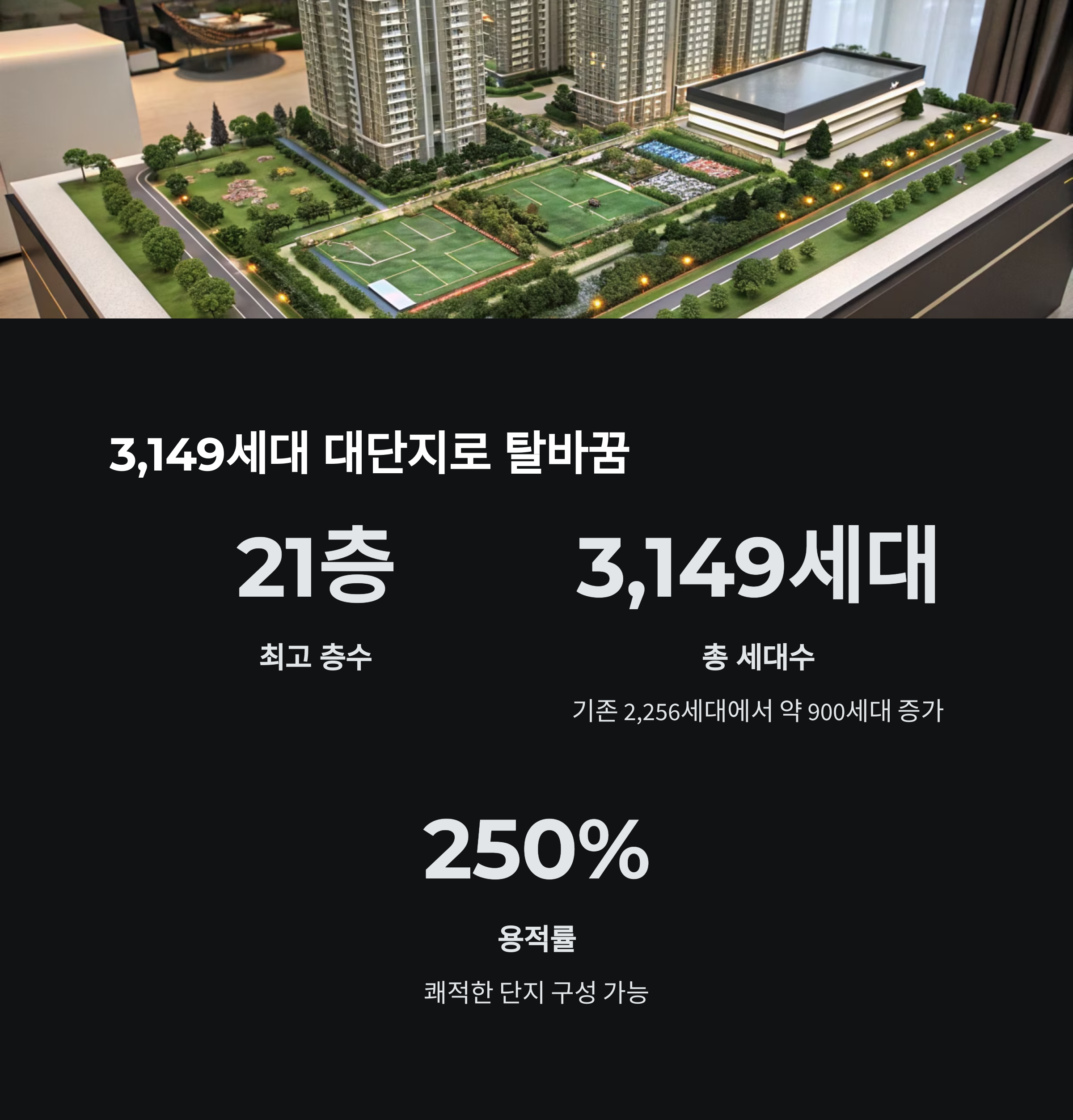 기존 2,256세대에서 약 900세대가 증가하며, 그 중 196세대는 공공주택으로 공급됩니다.