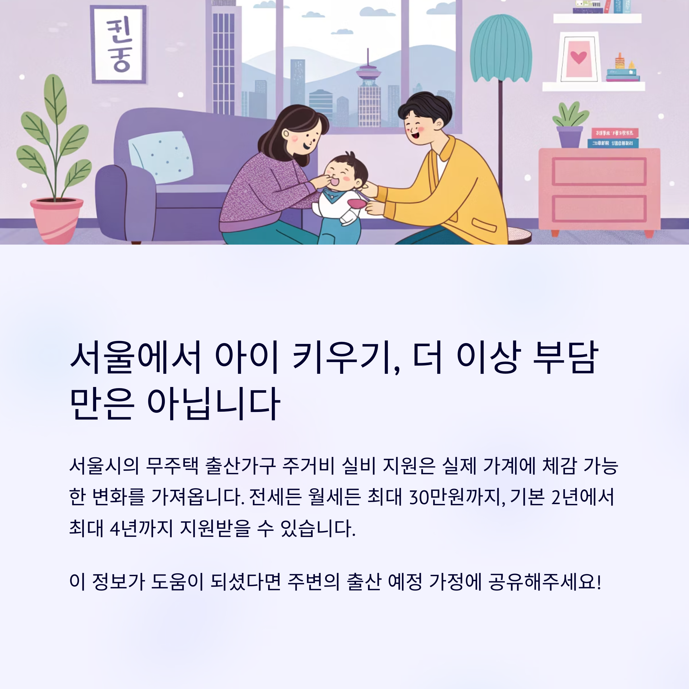 서울에 거주하면서 출산을 계획하거나 갓 출산한 가정이라면, 가장 큰 걱정 중 하나가 바로 주거 문제일 것입니다.높은 임대료와 양육비 부담이 동시에 닥칠 때, 서울을 떠나야 할까 고민하는
