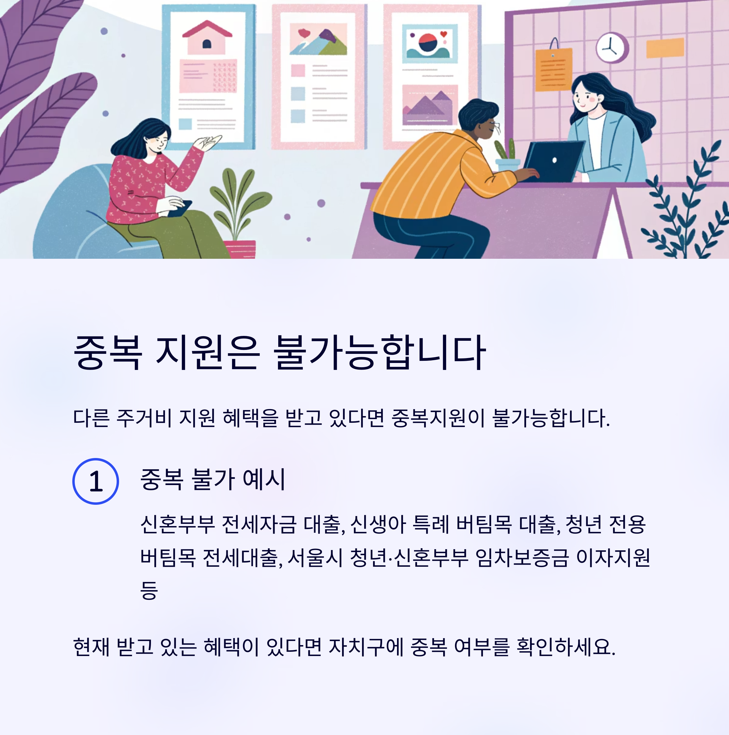 이미 다른 주거비 지원 혜택을 받고 있다면 중복지원은 불가합니다.