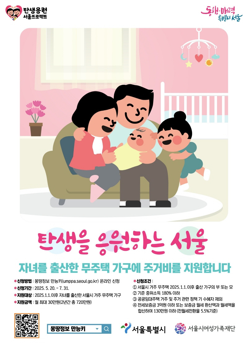 | 서울시 자녀출산 무주택가구, 전세대출이자 또는 월세 ‘실비 지원’까지! (0) | 2025.06.27 |