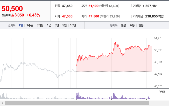 현재 한국가스공사의 주가는 50,500원으로, 전일 대비 변동이 없습니다. 주주 현황을 보면, 대한민국 정부(기획재정부)와 다른 한 개인이 46.63%의 지분을 보유하고 있습니다. 한국가스공사는 가스 산업에 속하는 기업으로, 현재 주가는 50,500원입니다. 이 회사의 시가총액은 4조 6,618억 원이며, 발행된 주식 수는 92,313,000주입니다. 외국인 보유 비율은 7.49%이며, 장중 거래량은 4,853,397주에 달했습니다. 또한, 한국가스공사의 매출액은 128,107억 원을 기록했습니다.