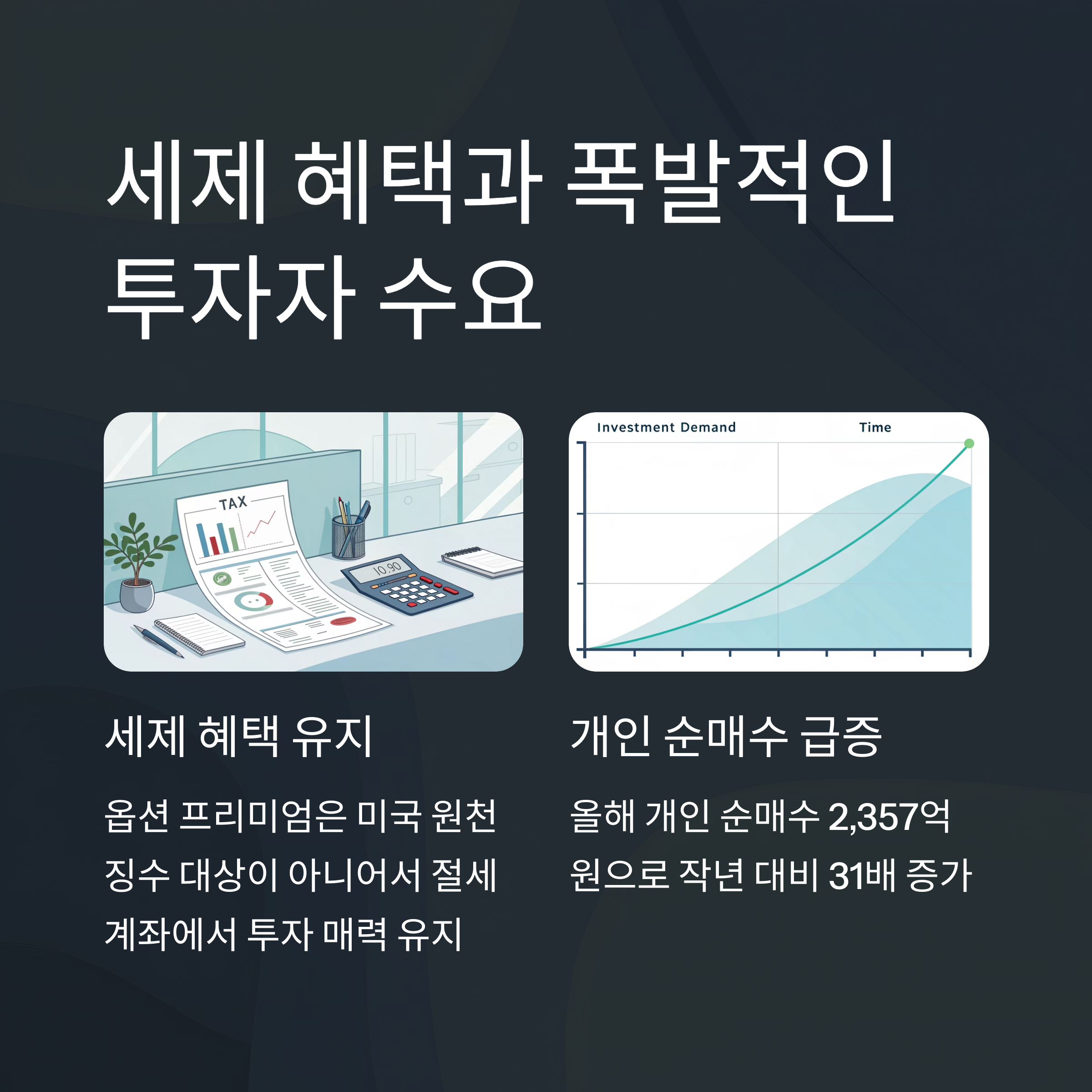 2025년 외납세액 공제 제도 개정으로 인해 해외 배당형 상품의 세제 혜택이 일부 축소될 수 있다는 우려가 있었습니다. 그러나 KODEX 미국배당커버드콜액티브 ETF의 경우, 커버드콜 전략으로 발생하는 옵션 프리미엄은 미국 원천징수 대상이 아니므로 기존 절세계좌(연금저축, IRP, ISA 등)에서의 투자 매력이 그대로 유지됩니다. 이는 절세를 중요하게 생각하는 장기 투자자들에게 매우 유리한 조건입니다.