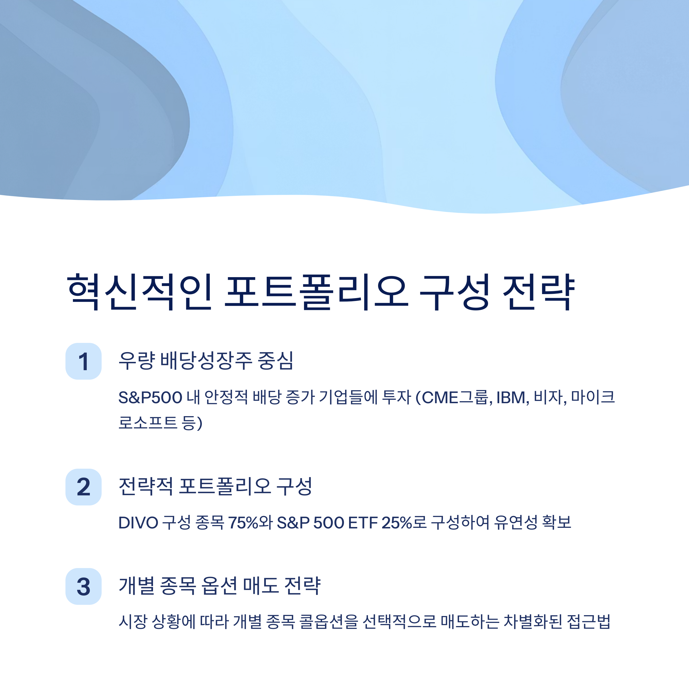 특히 2024년 6월 28일부터는 포트폴리오 구성이 더욱 전략적으로 변경되었습니다. 이제는 DIVO 구성 종목 75%와 S&P 500 ETF 25%로 구성되어, 기존 DIVO 전략의 장점을 유지하면서도 시장 상황에 따라 더욱 유연하게 대응할 수 있도록 설계되었습니다. 이러한 변화는 중장기적으로 미국 DIVO ETF와 차별화된 수익률을 만들어낼 가능성을 내포하고 있습니다.