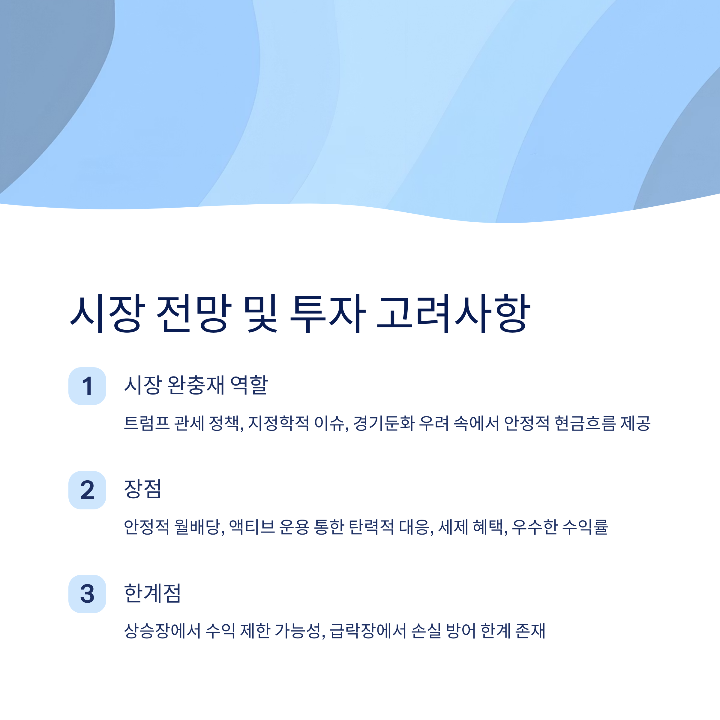 트럼프 관세 정책, 지정학적 이슈, 그리고 글로벌 경기둔화 우려가 커지는 현 상황에서, 안정적인 현금흐름을 제공하는 커버드콜 전략은 더욱 주목받고 있습니다. 특히 시장 과열 우려가 확산되는 시점에서 KODEX 미국배당커버드콜액티브 ETF는 포트폴리오의 일종의 완충재 역할을 수행하여 시장 하락 위험을 부분적으로 상쇄하고 꾸준한 수익을 제공할 수 있습니다.