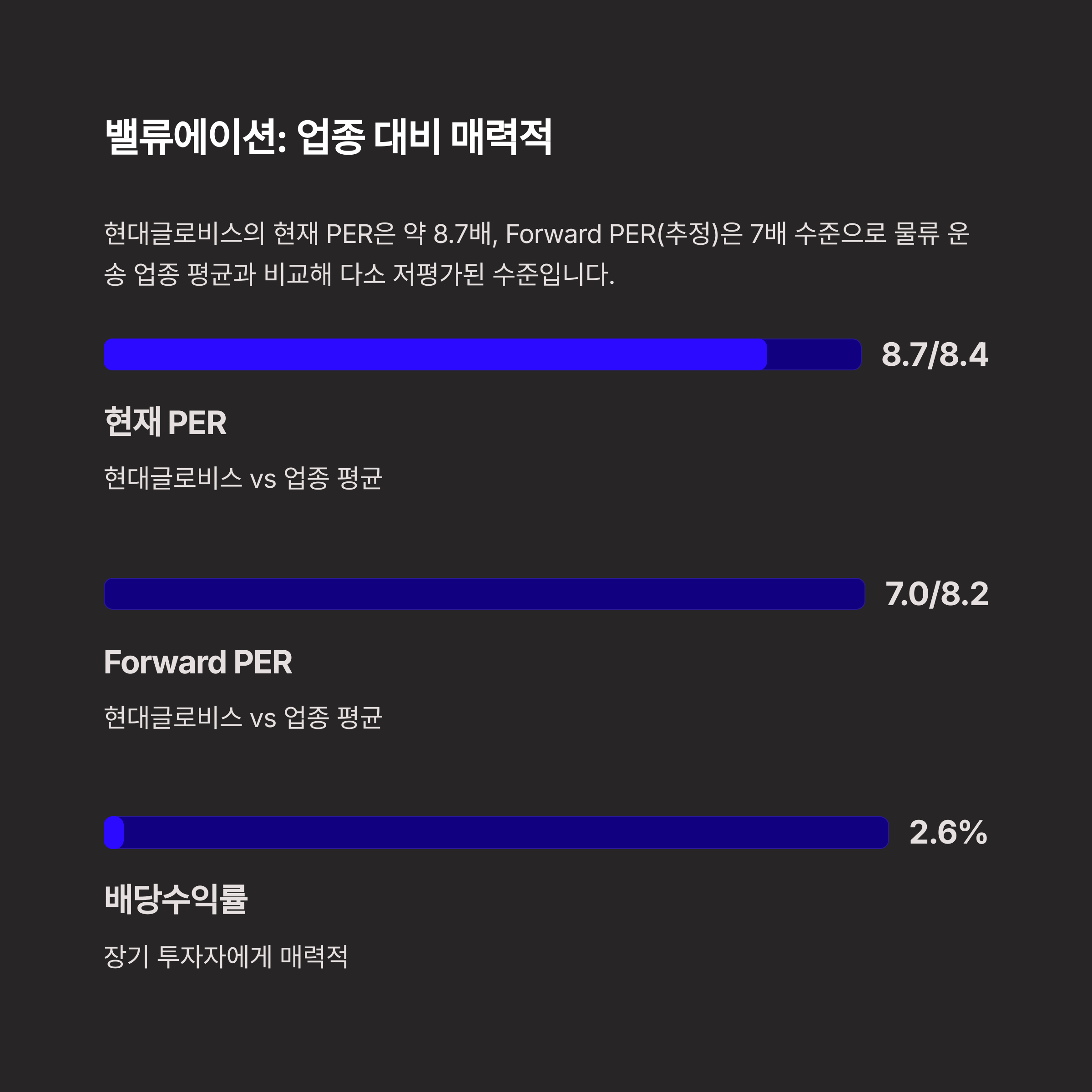 현대글로비스의 현재 PER은 약 8.7배, Forward PER(추정)은 7배 수준입니다.