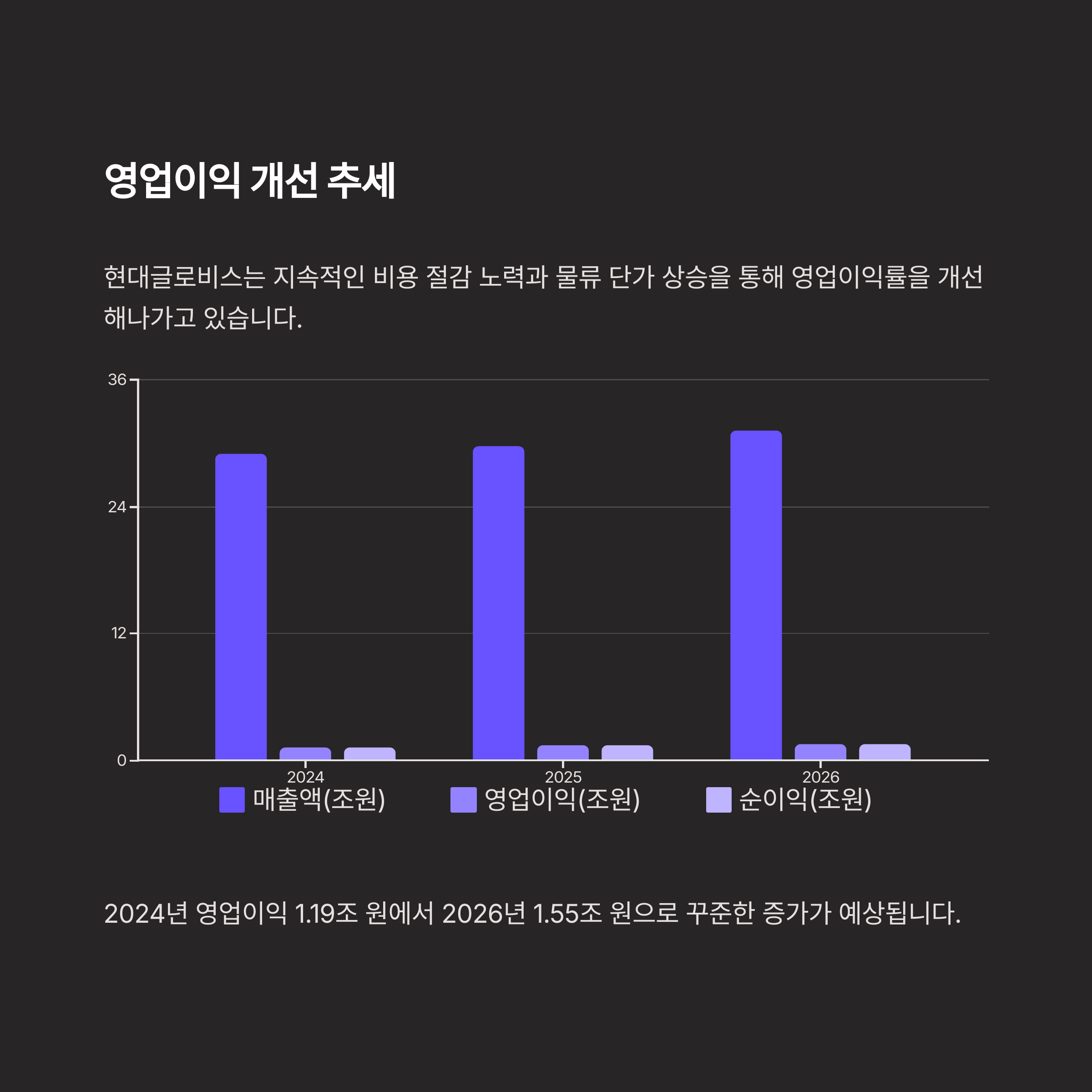 2024년부터 2026년까지 현대글로비스의 매출은 연평균 3.6% 정도