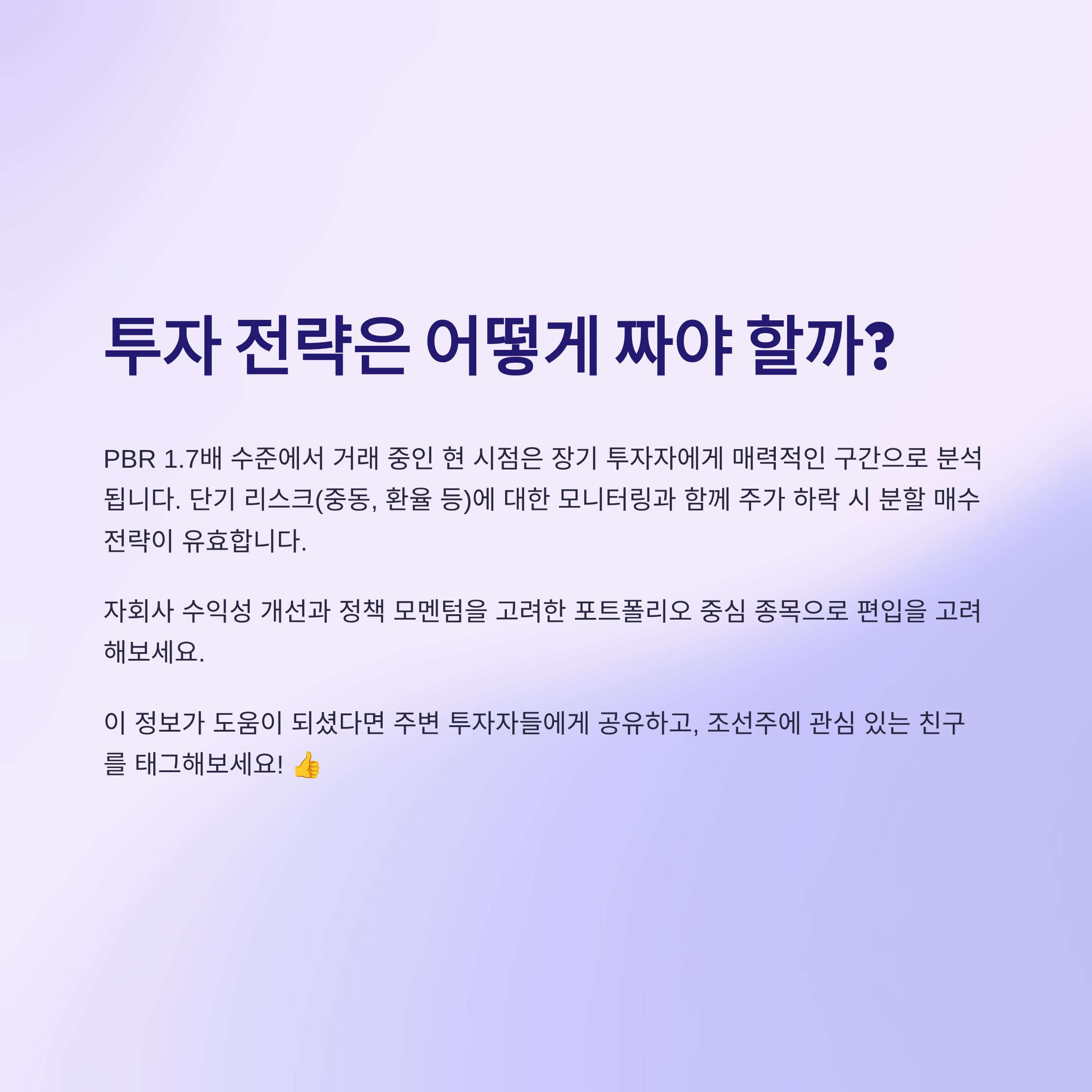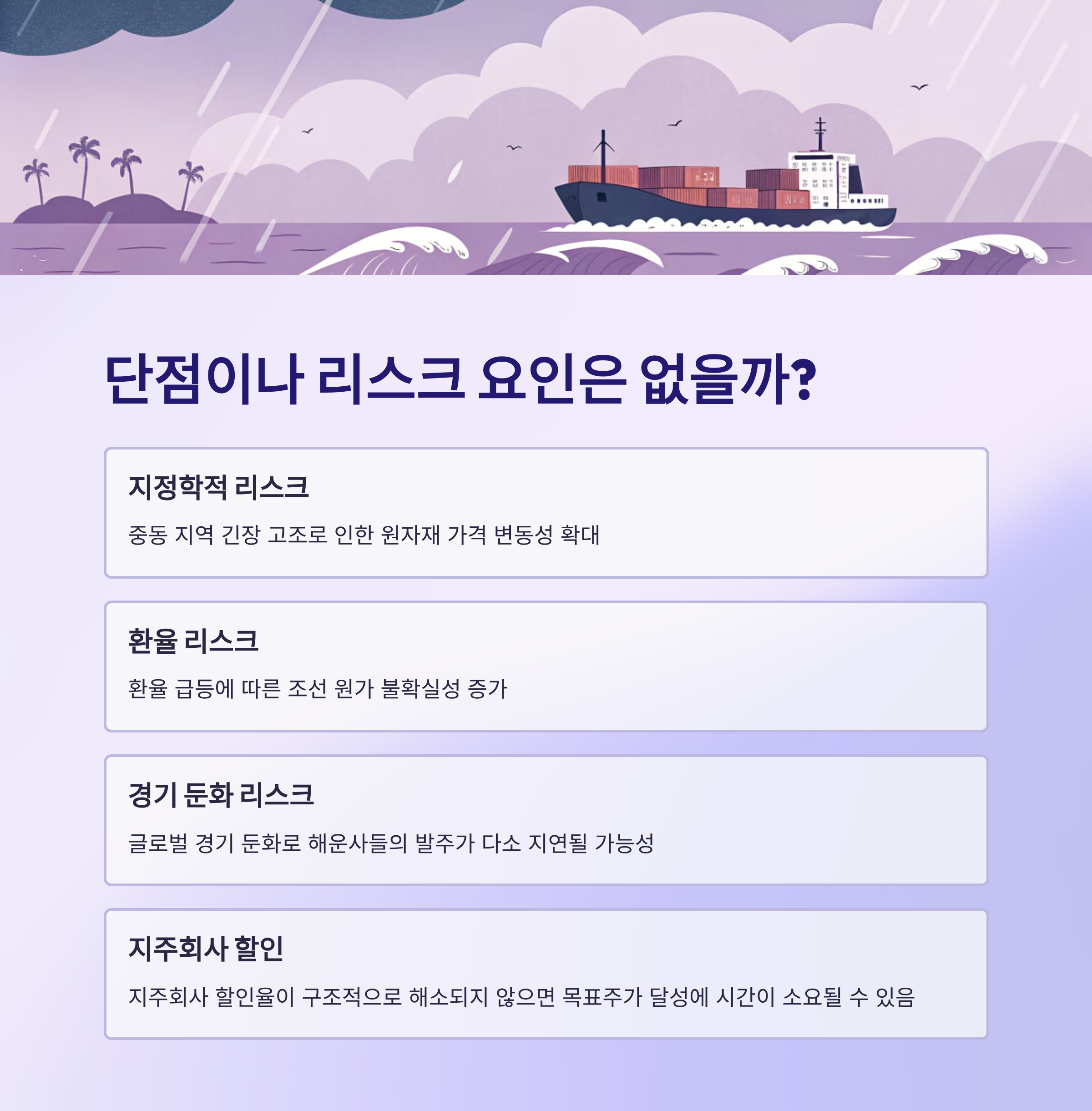 환율 급등에 따른 조선 원가 불확실성이 리스크입니다.