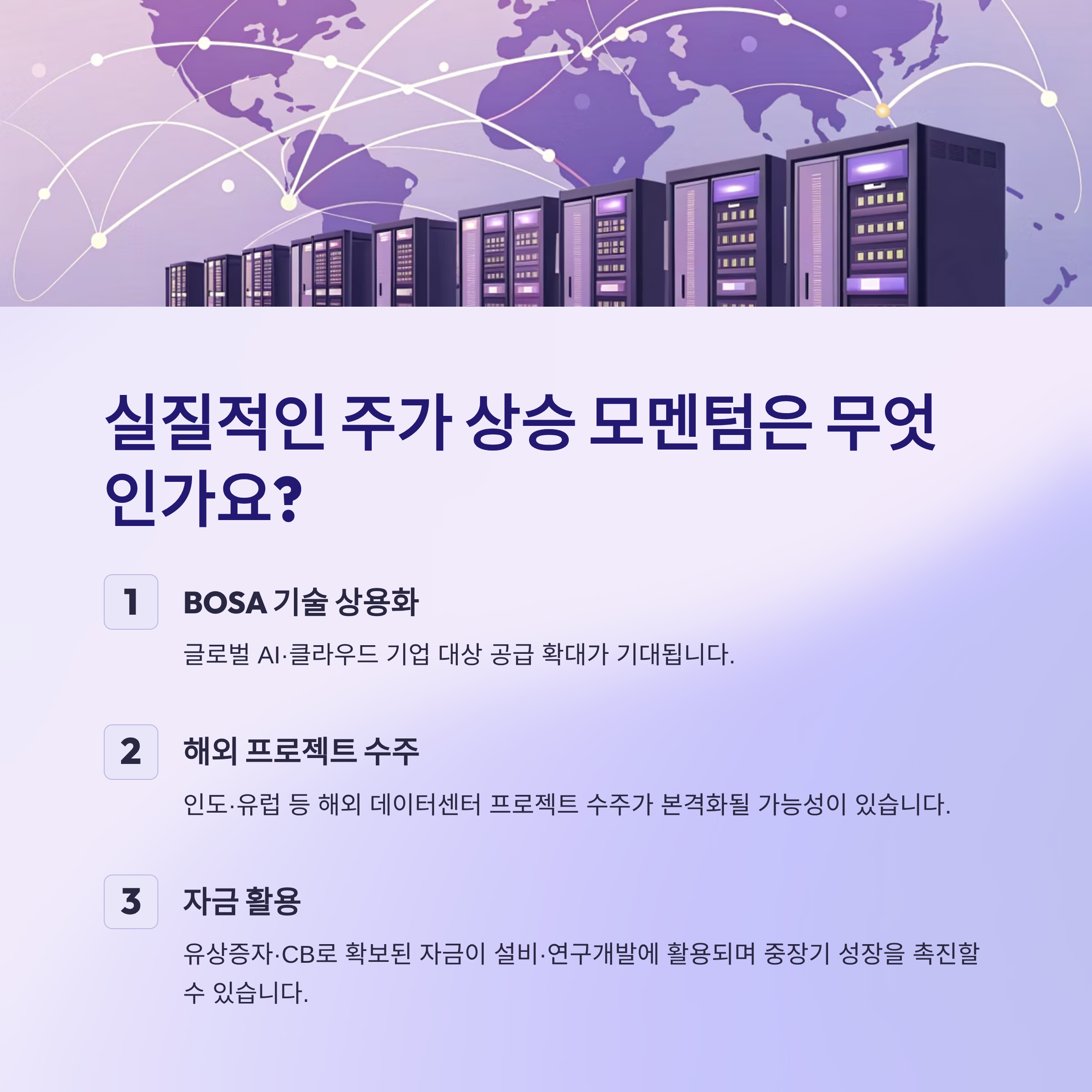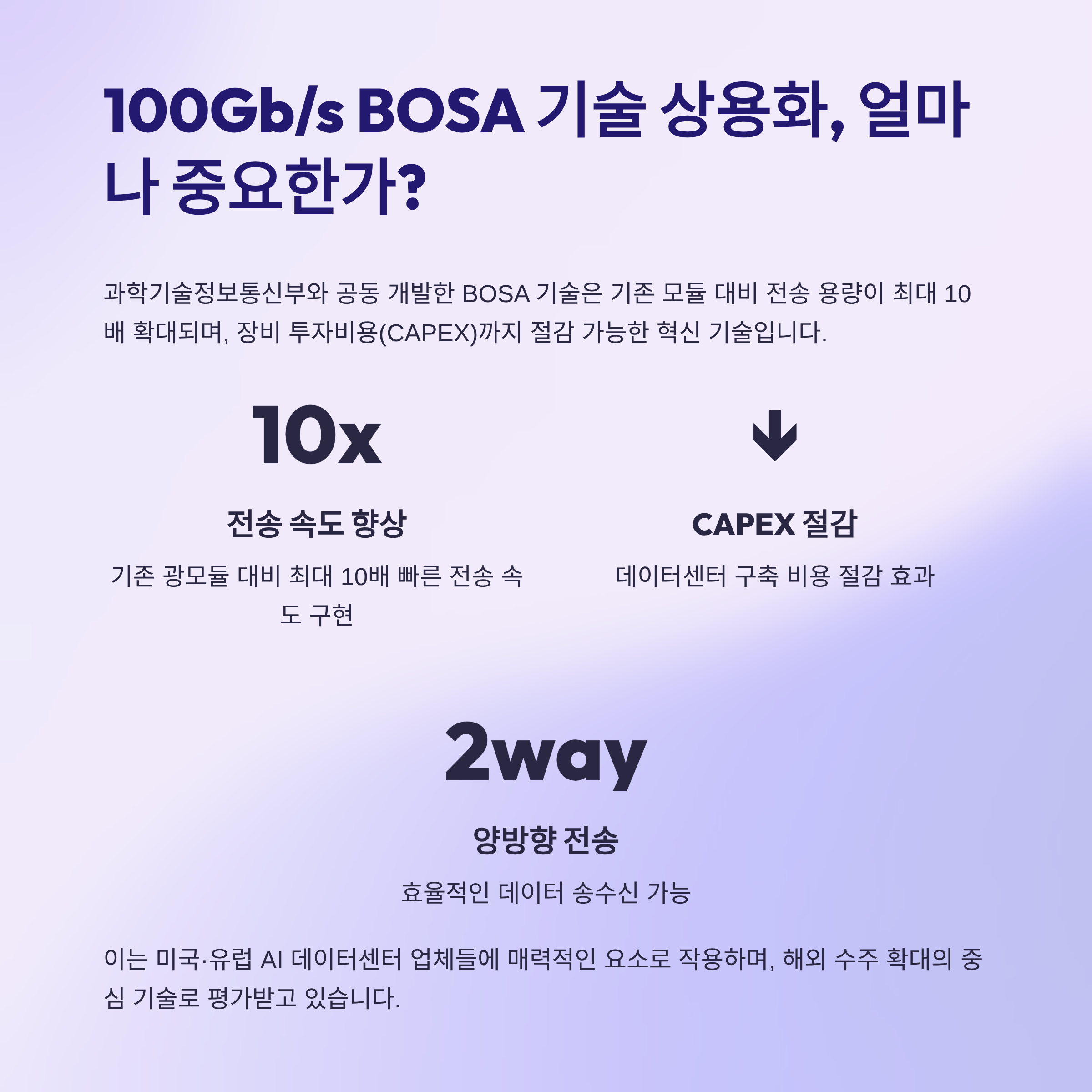 첫째, BOSA 기술 상용화로 글로벌 AI·클라우드 기업 대상 공급 확대가 기대됩니다.