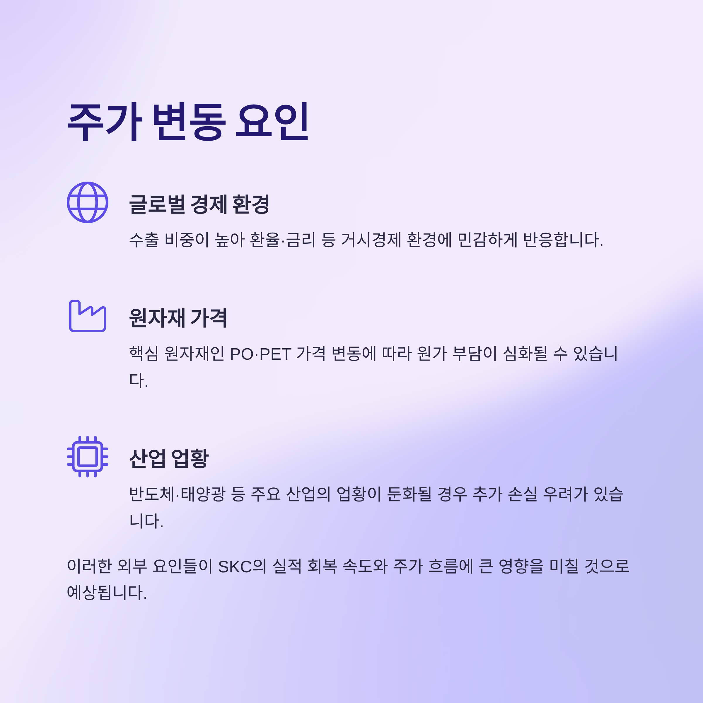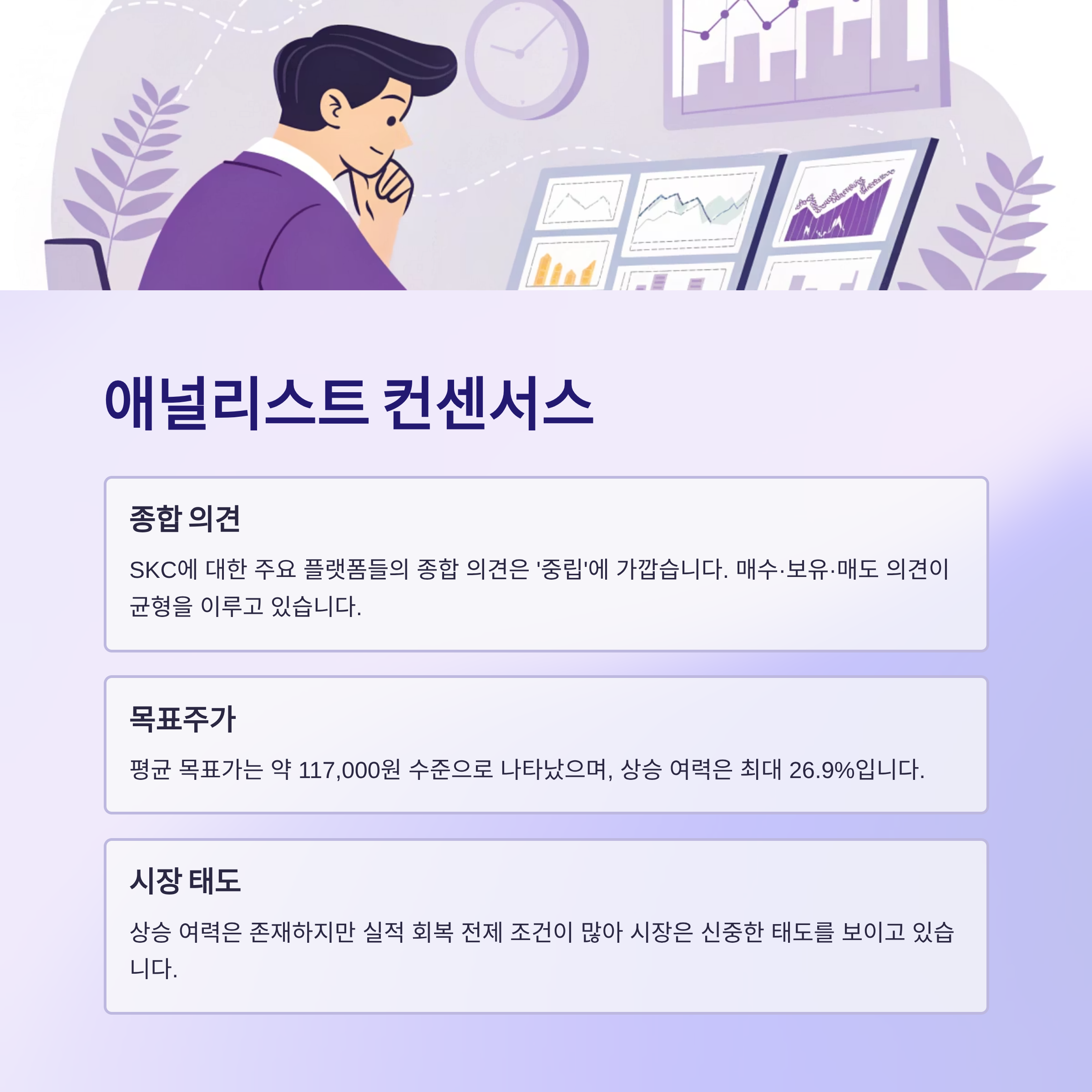 SKC는 2025년부터 태양광·2차전지·반도체 중심의 매출 확대가 기대되지만, 순손실 지속과 실적 회복 지연이 주가 반등의 발목을 잡고 있습니다. 현재 주가는 약 110,000원 선으로, 증권가 평균 목표주가(117,000원)까지 최대 27%의 상승 여력이 존재합니다. 그러나 실적의 턴어라운드 속도가 투자 판단의 핵심 변수로 작용합니다.