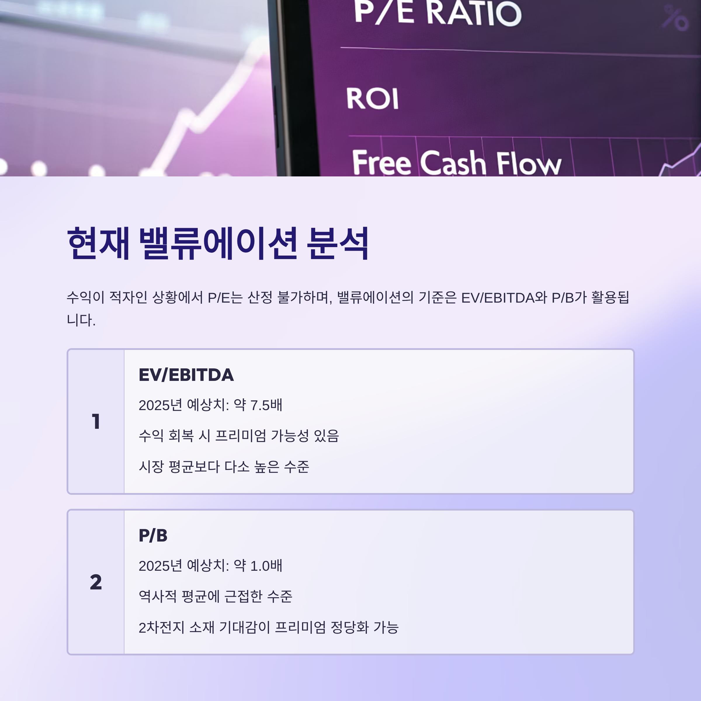 시장 평균보다 다소 높지만, 2차전지 소재 기대감이 이를 정당화할 수 있습니다.