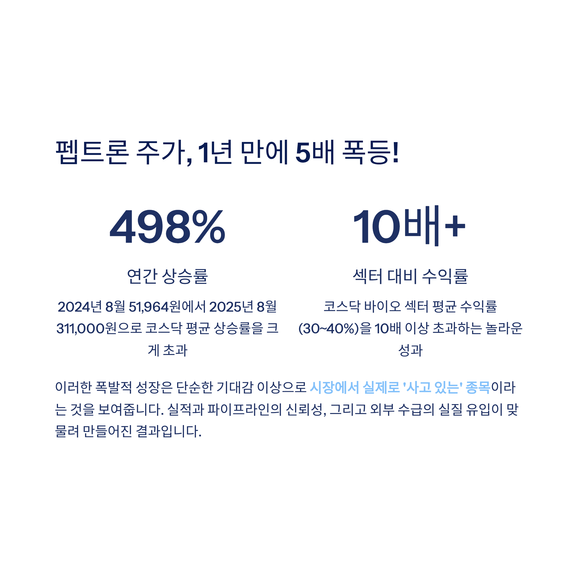 코스닥 바이오 섹터의 평균 수익률이 30~40% 수준에 머문 반면, 펩트론은 이를 10배 이상 초과하는 성과를 달성했습니다. 이는 실적과 파이프라인의 신뢰성, 그리고 외부 수급의 실질 유입이 맞물려 만들어진 결과로 분석됩니다.