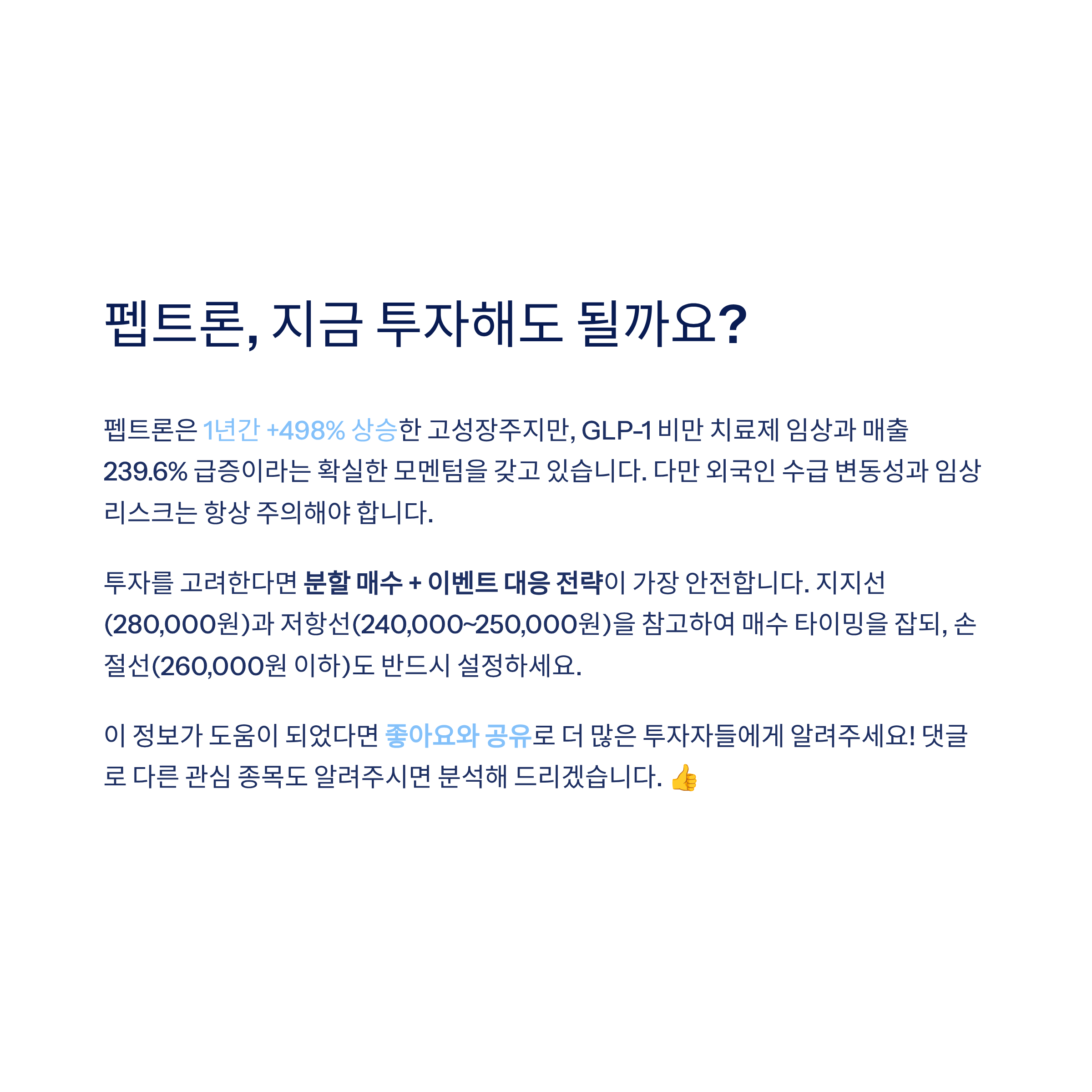 펩트론은 단기 급등 이후 고점 부담이 있는 종목임에도 불구하고, 실적과 기술력, 글로벌 시장 기대감이 여전히 유효한 종목입니다. 투자자라면 지금 시점에서 한 번에 큰 금액을 매수하기보다는 분할 매수 전략을 통해 주요 임상·계약 이벤트에 맞춰 유연하게 대응하는 것이 좋습니다. 핵심은 모멘텀의 '현실화' 여부입니다.