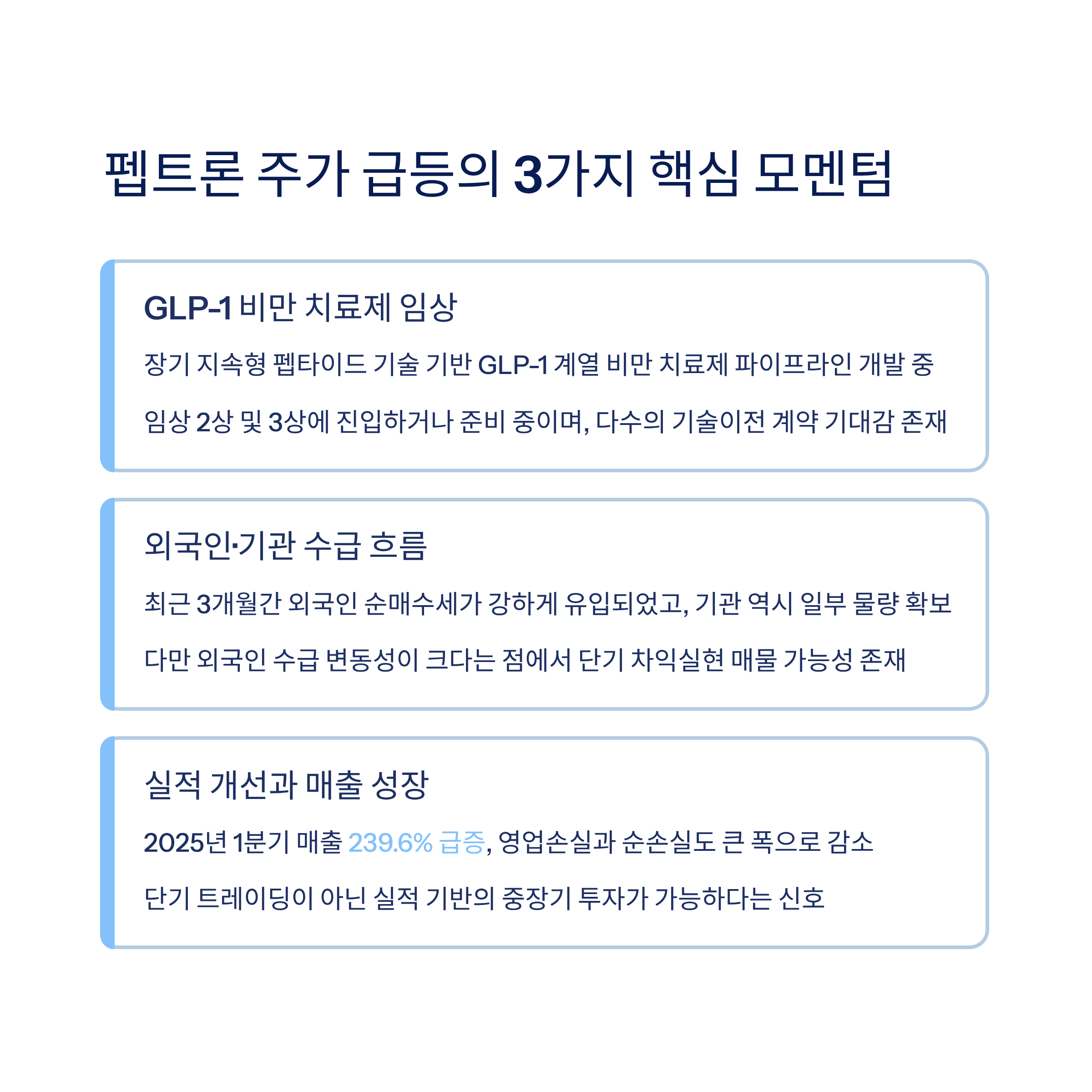2025년 1분기 펩트론은 전년 동기 대비 매출이 239.6% 급증하는 등 가시적인 실적 턴어라운드 조짐을 보였습니다. 영업손실과 순손실 역시 전 분기 대비 큰 폭으로 줄어들며 이익 개선 가능성을 높이고 있습니다. 이는 단기 트레이딩이 아닌 실적 기반의 중장기 투자가 가능하다는 신호로 해석할 수 있습니다.