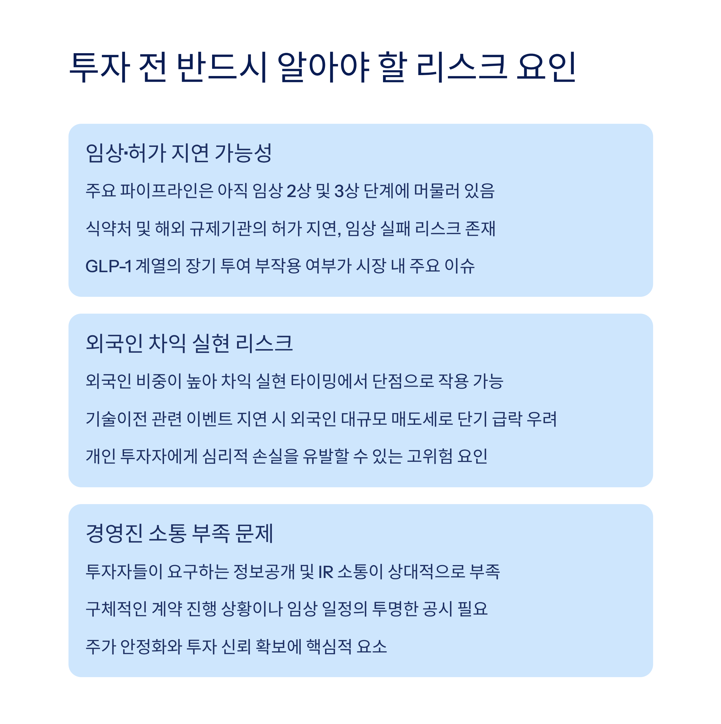 외국인 비중이 높다는 점은 상승장에서는 장점이지만, 차익 실현 타이밍에서는 단점으로 작용합니다. 특히 기술이전 관련 이벤트가 지연되거나 부정적 결과가 나올 경우, 외국인 대규모 매도세로 인해 단기 급락이 발생할 수 있습니다. 이는 개인 투자자에게 심리적 손실을 유발할 수 있는 고위험 요인입니다.