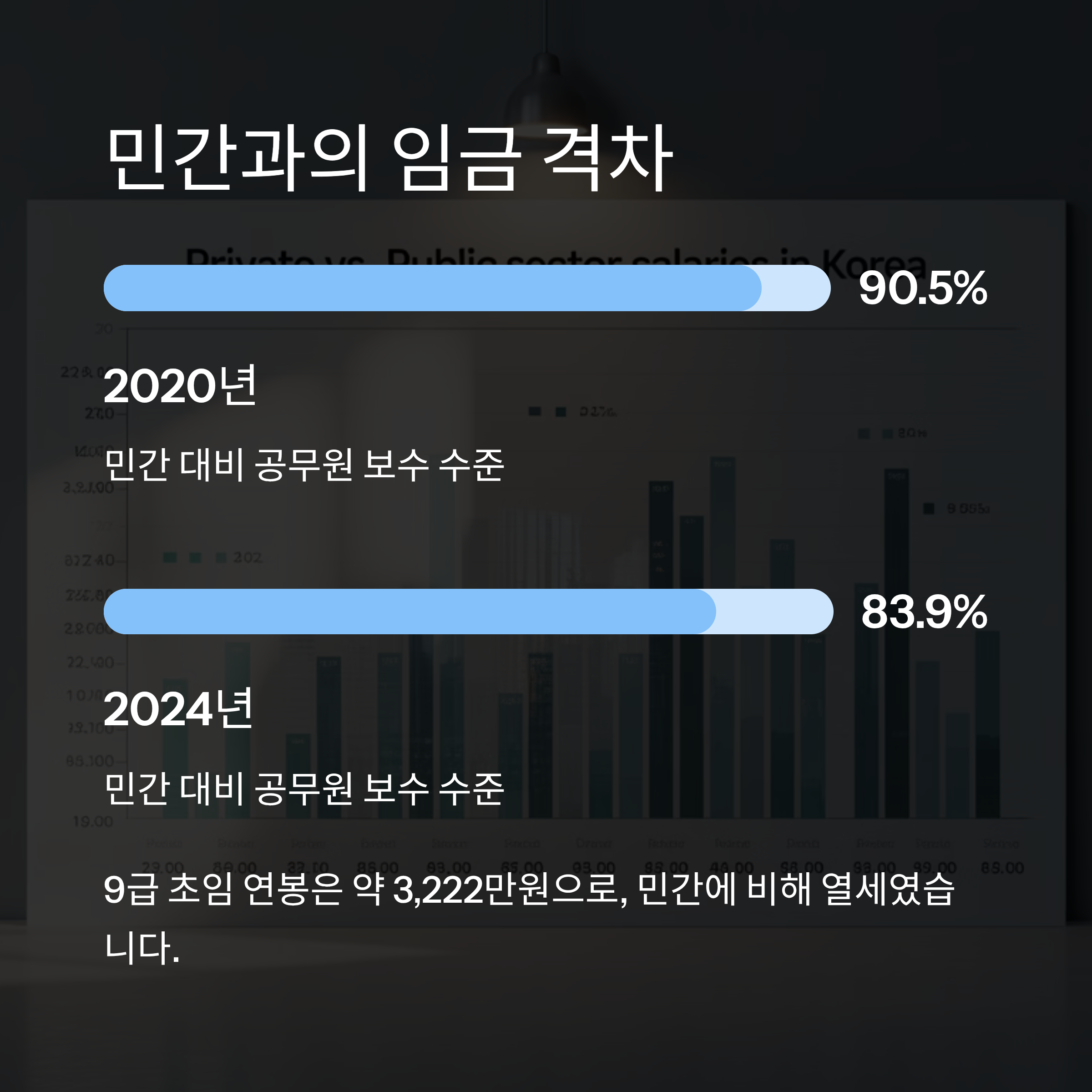 2020년 기준으로 공무원 보수는 민간 대비 90.5% 수준이었지만, 2024년에는 83.9%까지 하락한 상황이었습니다.