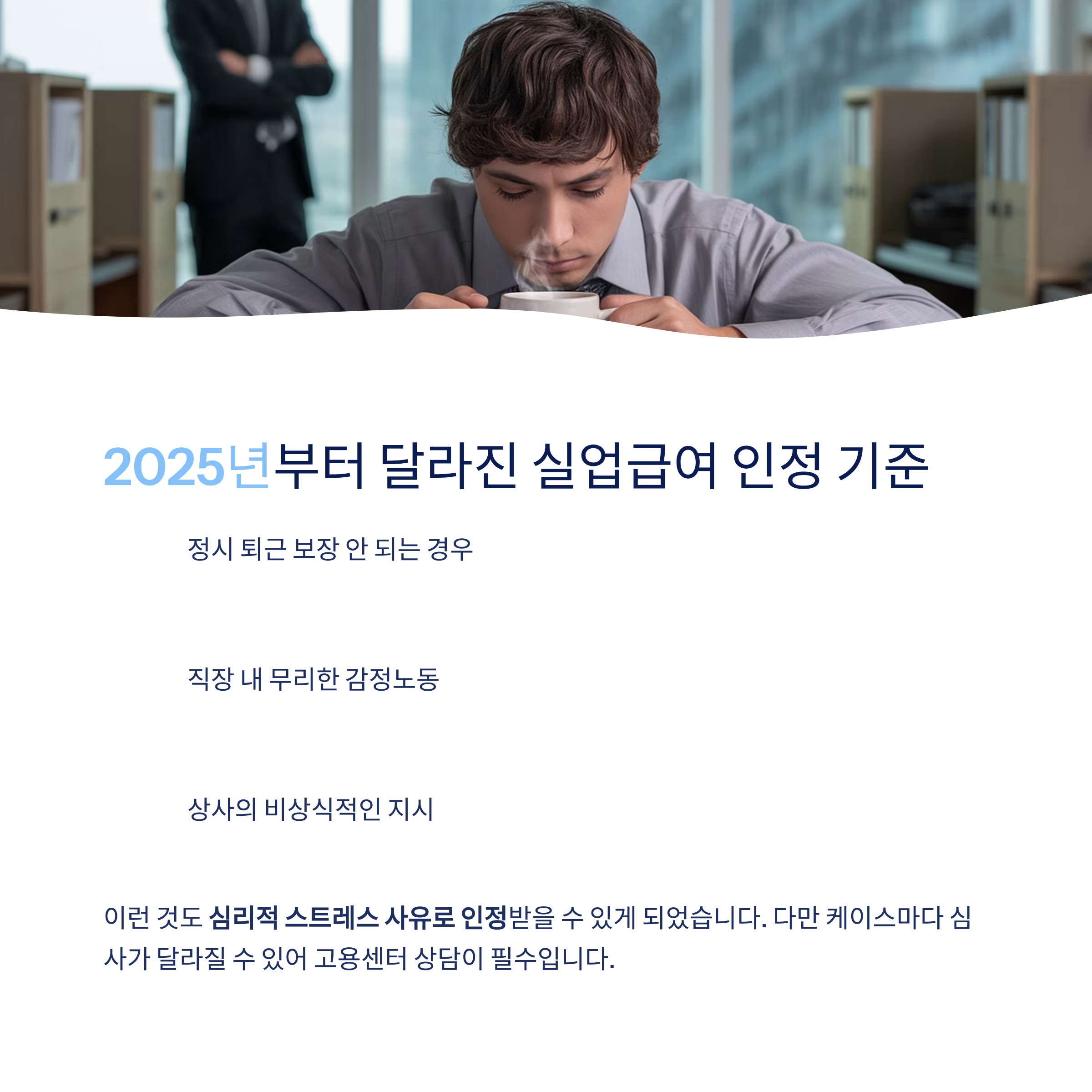 이런 것도 심리적 스트레스 사유로 인정받을 수 있게 되었죠. 다만 여전히 케이스마다 심사가 달라질 수 있어 고용센터 상담이 필수입니다.