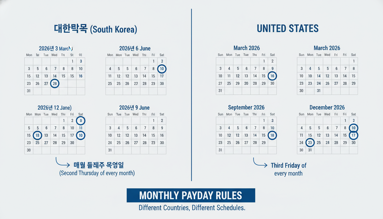 A1: 아니요, 다릅니다. 한국은 매 분기(3, 6, 9, 12월)의 둘째 목요일이고, 미국은 매 분기(3, 6, 9, 12월)의 셋째 금요일입니다. 2026년 3월의 경우, 한국은 3월 12일 목요일, 미국은 3월 20일 금요일입니다.