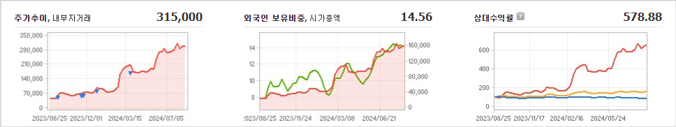 현재 알테오젠의 주가는 315,000원으로, 전일 대비 변화가 없는 상태입니다. 주주 현황을 살펴보면 박순재 외 3인이 20.51%의 지분을 보유하고 있습니다. 알테오젠은 바이오 기업으로, 현재 장중 주가는 315,000원입니다. 이 회사의 시가 총액은 16조 7,418억 원이며, 발행된 주식 수는 53,148,528주입니다. 외국인 투자자의 보유 비중은 14.56%이며, 장중 거래량은 1,244,378주에 달했습니다. 또한, 알테오젠의 매출액은 471억 원에 이릅니다.