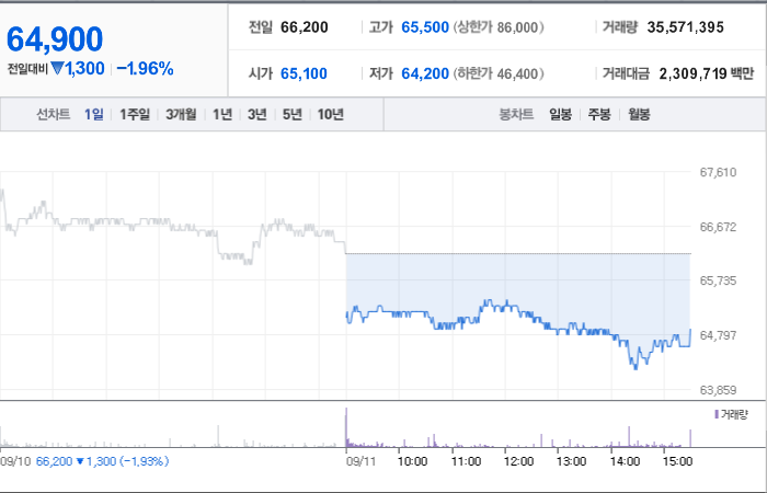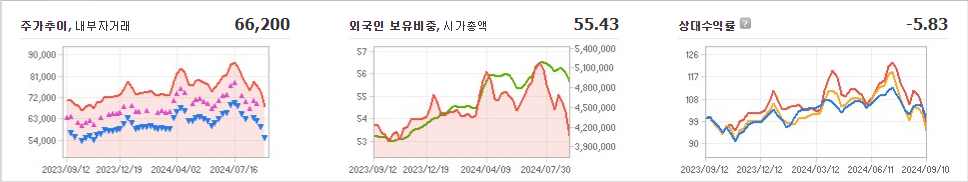 현재 삼성전자의 주가는 66,200원으로, 전일 대비 1,300원이 하락한 상태입니다. 주주 현황을 살펴보면 삼성생명보험 및 15명의 개인이 함께 20.08%의 지분을 보유하고 있습니다. 삼성전자는 반도체와 관련 장비를 주로 다루는 기업으로, 장중 기준으로 주가는 66,200원입니다. 삼성전자의 시가 총액은 387조 4,389억 원이며, 총 발행 주식 수는 5,969,782,550주입니다. 외국인이 보유한 비율은 55.43%이며, 장중 거래량은 30,651,376주에 달했습니다. 또한, 삼성전자의 매출액은 1,459,839억 원에 이릅니다.