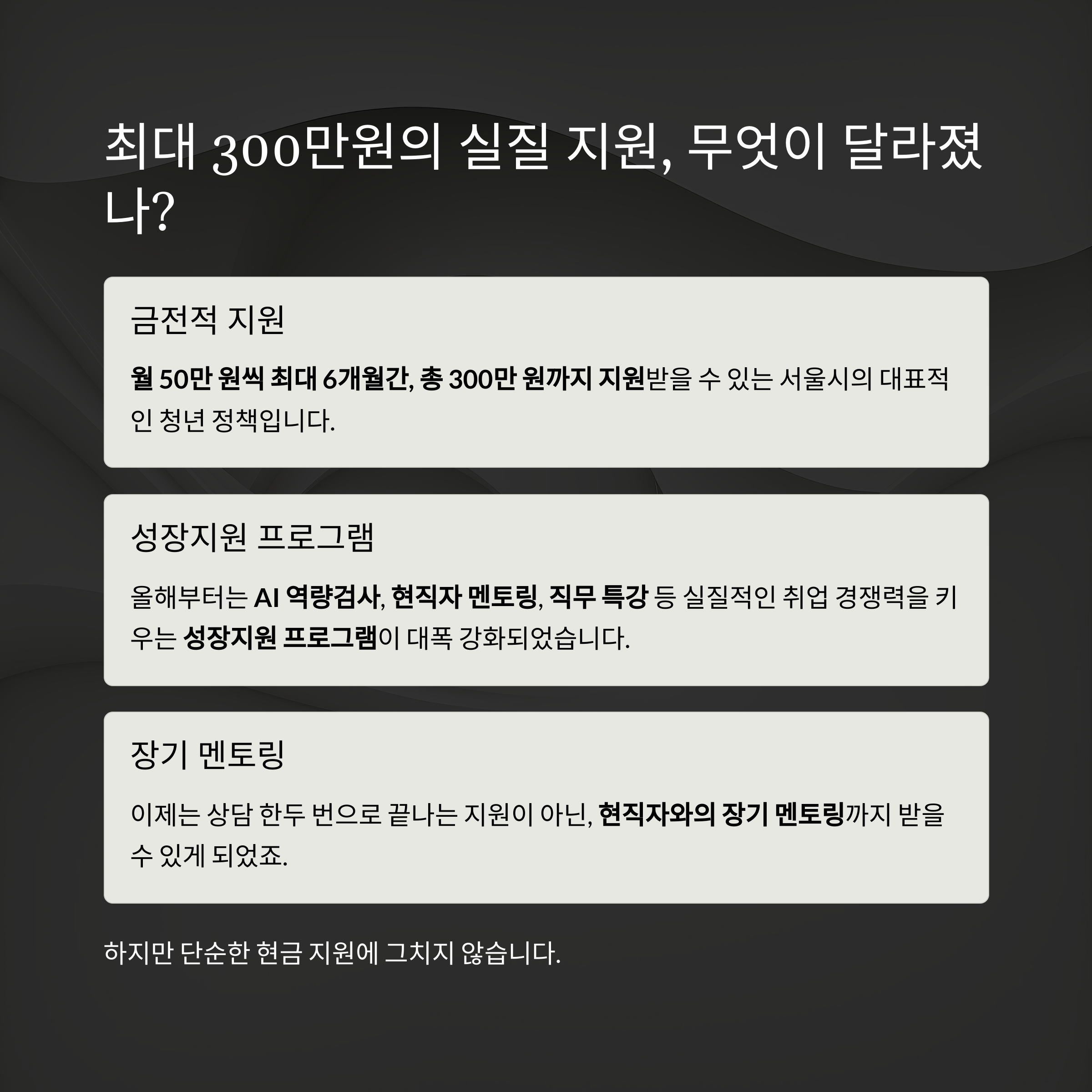 청년수당은 월 50만 원씩 최대 6개월간, 총 300만 원까지 지원받을 수 있는 서울시의 대표적인 청년 정책입니다. 하지만 단순한 현금 지원에 그치지 않습니다.