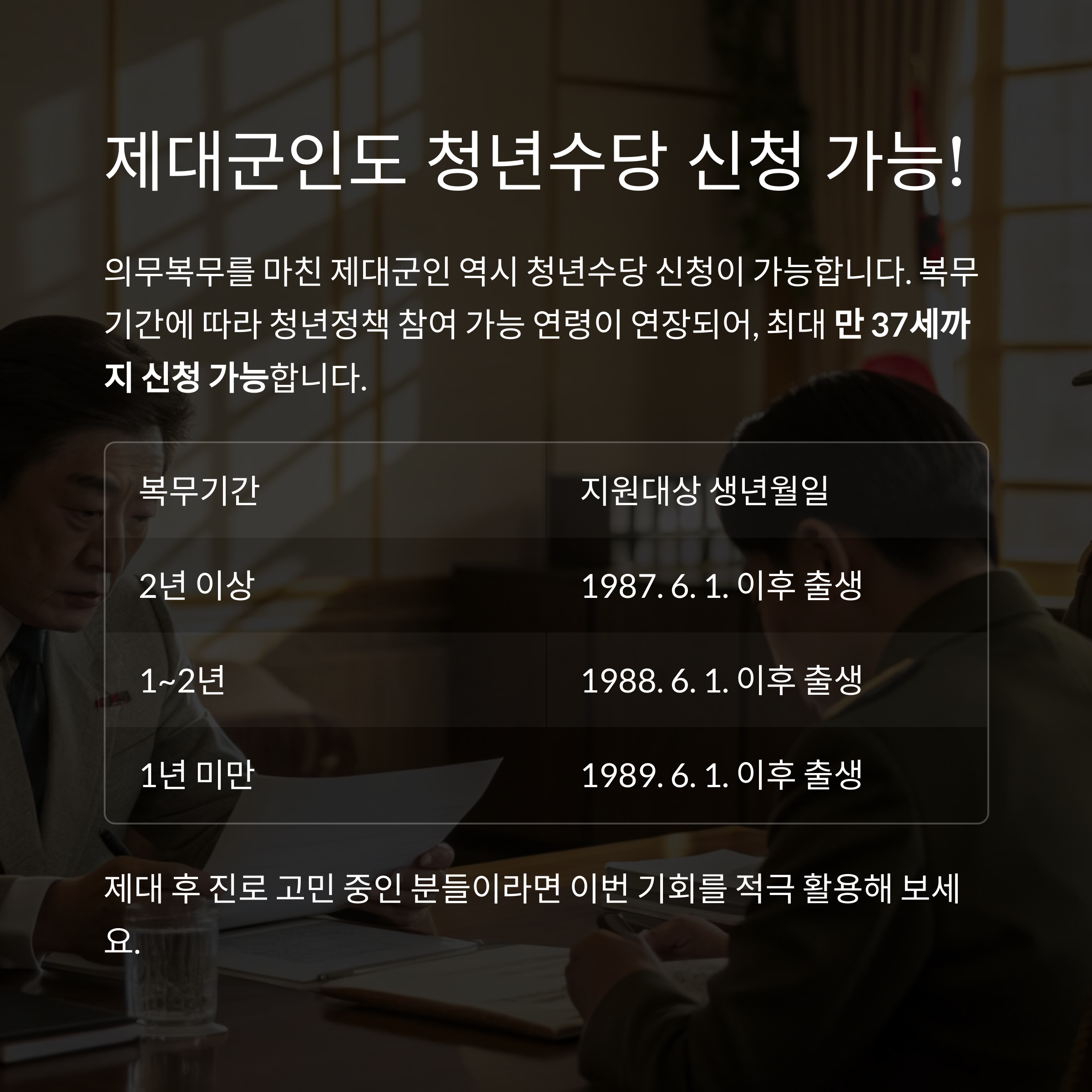 의무복무를 마친 제대군인 역시 청년수당 신청이 가능합니다.
