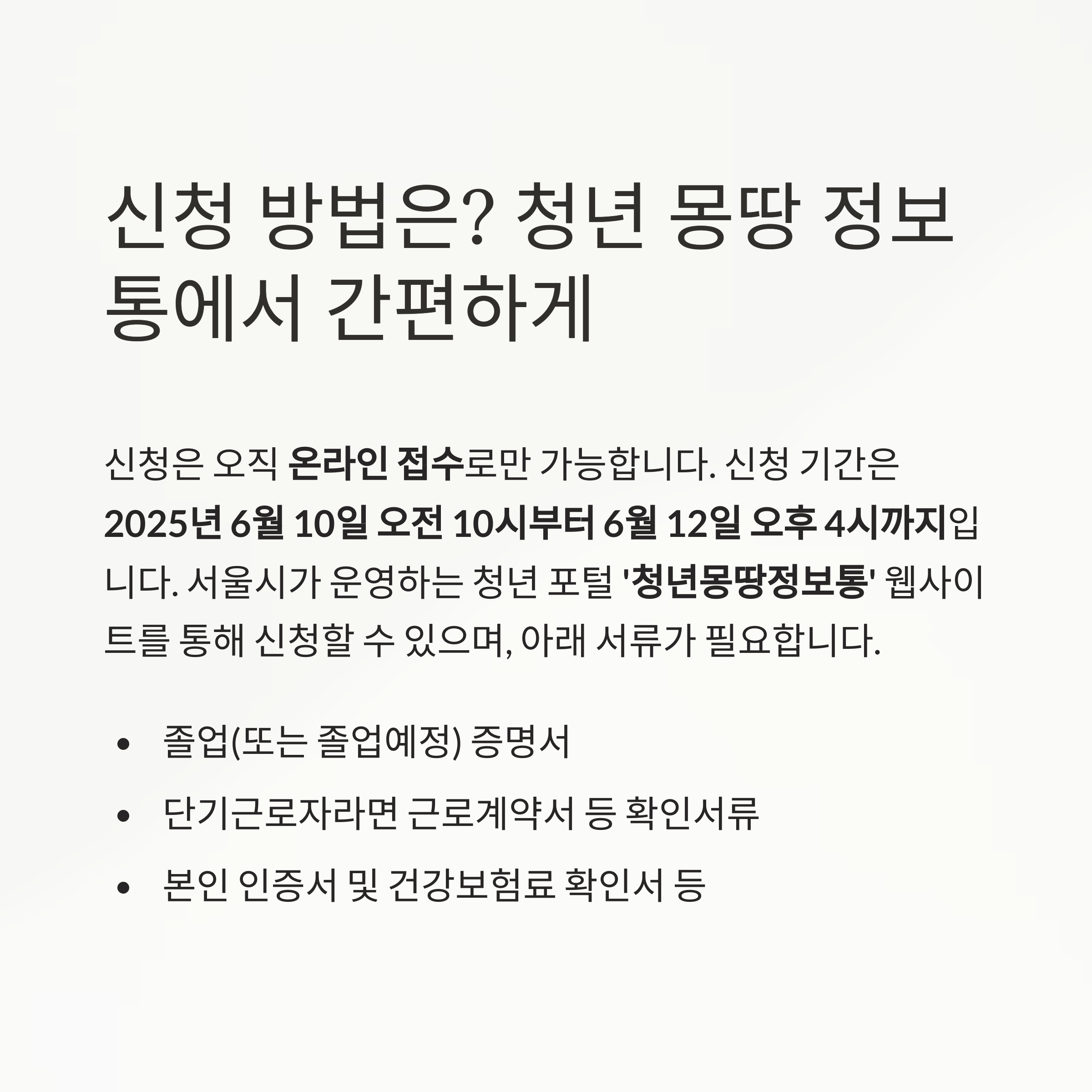 서울시가 운영하는 청년 포털 ‘청년몽땅정보통’ 웹사이트를 통해 신청할 수 있으며, 아래 서류가 필요합니다.